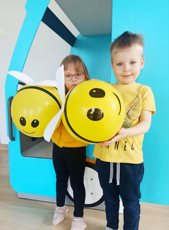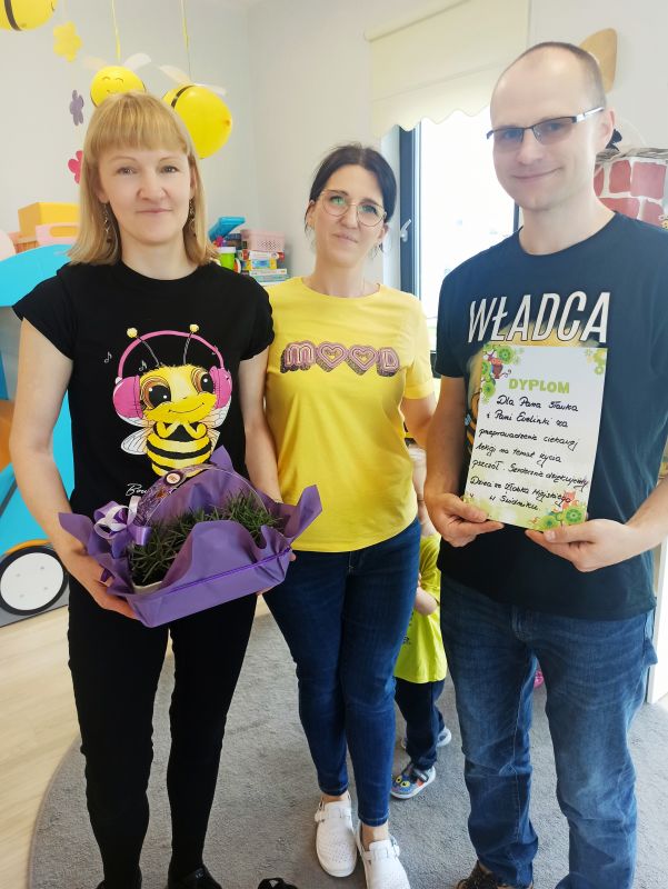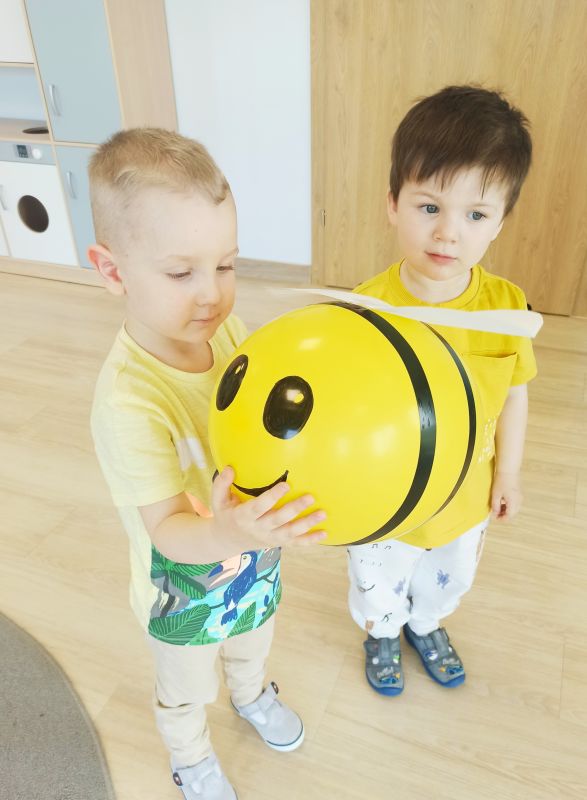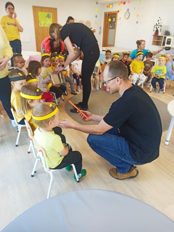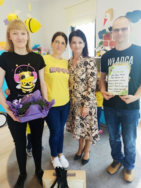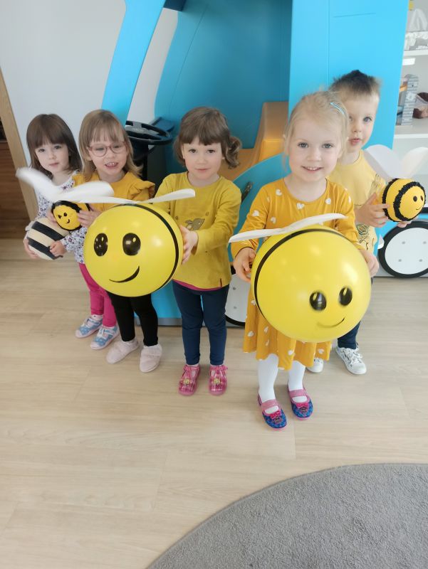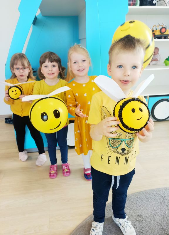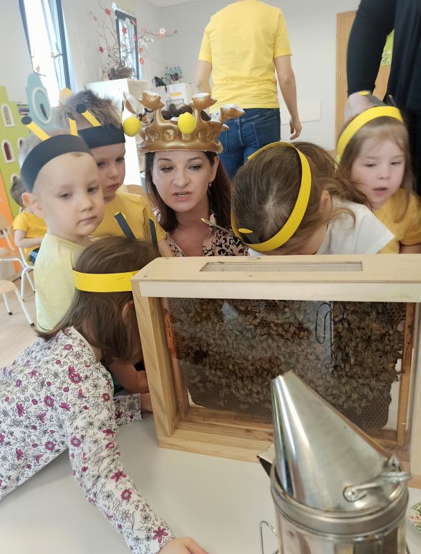 W sali ozdobionej balonowymi, żółto-czarnymi owadami pojawili się goście specjalni spotkania. Pani Ewelina i pan Sławek zaprezentowali dzieciom ul z pszczołami i królową, a także sprzęt pszczelarza: rojnicę, podkurzacz, dłuta, miotełki, wosk- wąs, pyłek, kapelusze. Pan Sławek przedstawił również ciekawostki na temat zapylaczy, na przykład jak długo żyją i jakie odległości są w stanie pokonać. Za przeprowadzenie ciekawej lekcji goście otrzymali pamiątkowy dyplom i upominek.