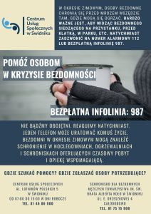 Po pomoc dla osób w kryzysie bezdomności można zgłaszać się również do Centrum Usług Społecznych w Świdniku przy al. Lotników Polskich 5, od poniedziałku do piątku, w godzinach 8.00-15.00, nr tel. 81 468 69 00.
