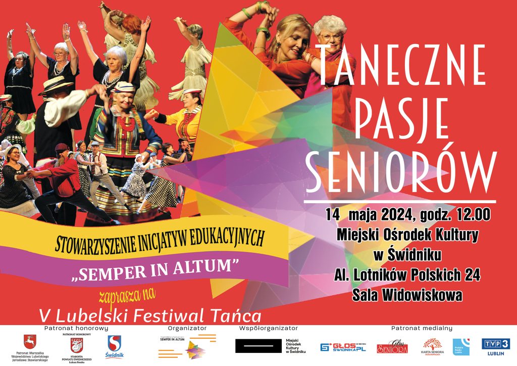 Już 14 maja na scenie Miejskiego Ośrodka Kultury będziemy mogli podziwiać ponad 200 tancerzy, którzy zaprezentują swoje umiejętności podczas V Lubelskiego Festiwalu Tańca „Taneczne Pasje Seniorów”. Organizatorem wydarzenia, rozpoczynającego się o godz. 12.00, jest Stowarzyszenie Inicjatyw Edukacyjnych „Semper In Altum” we współpracy z Miejskim Ośrodkiem Kultury.