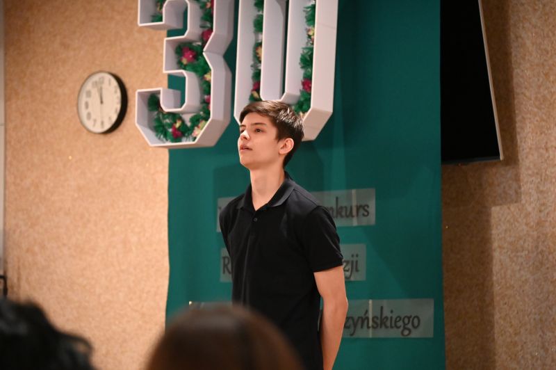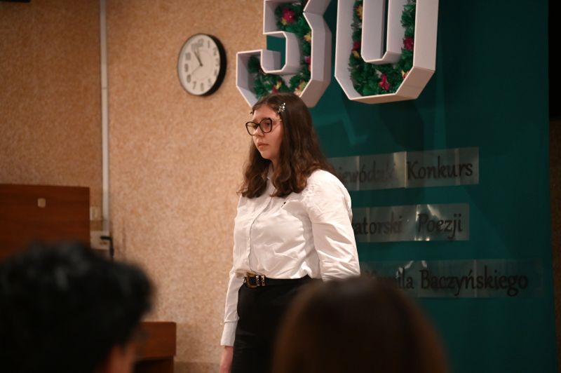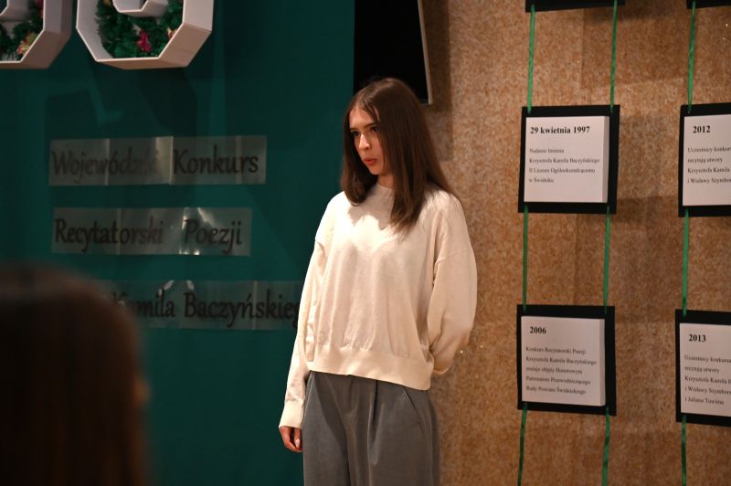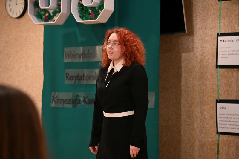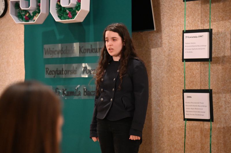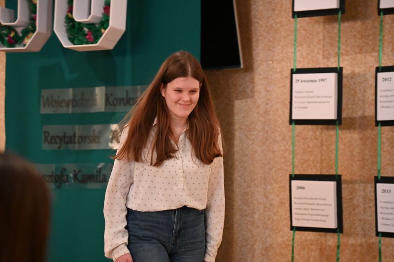 Później scena należała już do recytatorów, którzy zmierzyli się z takimi utworami, jak, między innymi: „Bajka”, „Rodzicom”, „Z głową na karabinie”, „Nie bój się nocy”, „Pokolenie”, „Ballada o pociągu”, „Warszawa”, „Wyzwanie”, „Dwie miłości”. Nadali im swój indywidualny charakter, wydobywając zarówno subtelność, jak i dramatyzm wpisany w twórczość poety. Każda interpretacja była inna – jedne poruszały delikatnością i refleksyjnością, inne uderzały siłą emocji i ekspresją. Jury: Aneta Gębal z Miejsko-Powiatowej Biblioteki Publicznej, Ewa Jaśkowiak z Miejskiego Ośrodka Kultury i Irena Glinka, animatorka kultury, instruktorka teatralna, nie miało więc łatwego zadania.