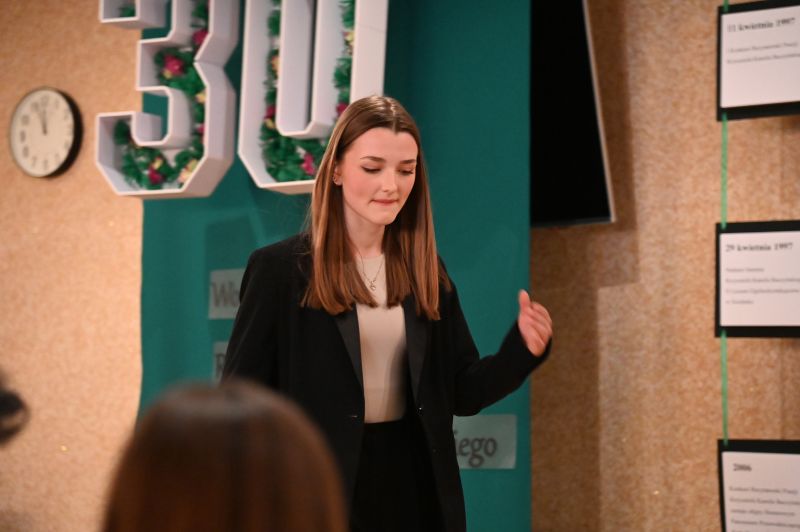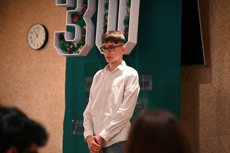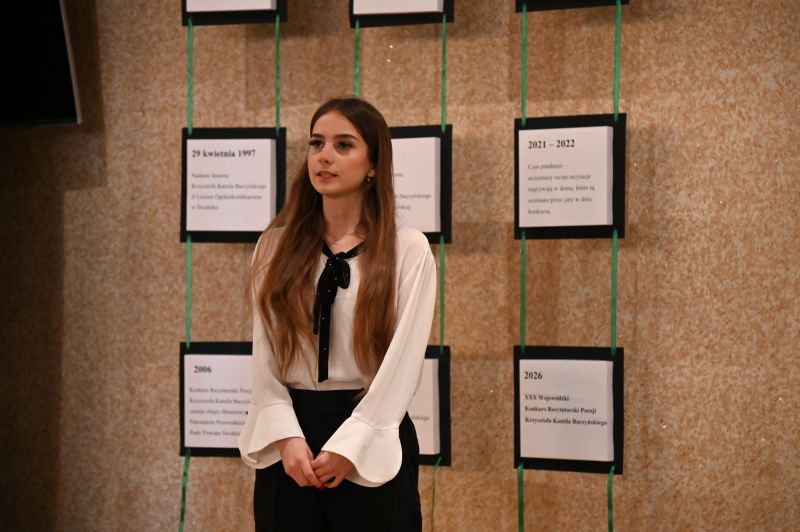 – Cieszymy się, że odpowiedzieliście na nasze zaproszenie i że możemy się wszyscy spotkać w szkolnej auli. 11 kwietnia minie 30 lat odkąd ten niezwykły, polski poeta okresu wojny i okupacji, patron II Liceum Ogólnokształcącego w Świdniku, jest bohaterem naszego konkursu recytatorskiego. Pozwólcie, że przypomnimy kilka dat: 11 kwietnia 1997 roku odbył się pierwszy Konkurs Recytatorski Poezji Krzysztofa Kamila Baczyńskiego. 20 kwietnia tego samego roku poeta został patronem naszej szkoły. W 2006 roku konkurs zostaje doceniony w środowisku naszego miasta i zostaje objęty honorowym patronatem przewodniczącego Rady Powiatu, a był nim wtedy ówczesny dyrektor i inicjator powstania placówki, nieżyjący już Ryszard Borowiec. Poezji Baczyńskiego w kolejnych latach towarzyszyły wiersze innych polskich poetów i poetek: Czesława Miłosza, Wisławy Szymborskiej, Juliana Tuwima. W 2016 roku konkurs zostaje objęty honorowym patronatem Lubelskiego Kuratora Oświaty i zyskuje rangę wojewódzkiego. Konkurs odbył się również w trudnych chwilach pandemii, tylko w innej formule. Dzisiejszy konkurs jest XXX, wojewódzki i pod honorowym patronatem Lubelskiego Kuratora Oświaty Tomasza Szabłowskiego. Okazuje się, że moc słowa poetyckiego twórcy spełnionej apokalipsy i katastrofisty ma wiele do zaoferowania wrażliwym czytelnikom także XXI wieku. Poezja naszego patrona, urodzonego w 1921 roku, trafia i dziś do wrażliwych młodych ludzi oraz sprawia, że ciągle pamiętamy o dramacie pokolenia Kolumbów i tragedii II wojny światowej. W poezji Baczyńskiego jest również sporo emocji, rozterek i refleksji każdego młodego człowieka. W 2026 roku, w 82. rocznicę śmierci Baczyńskiego ta po9ezja nabiera nowego wymiaru. Wszyscy boimy się, że to, co było może przyjść. Dlatego niech słowa poety będą ostrzeżeniem, przestrogą, żeby nie trzeba było powtarzać słów Stanisława Pigonia, iż „należymy do narodu, którego losem jest strzelać do wroga z brylantów” – mówili Kaja i Kuba, uczniowie II LO, którzy poprowadzili dzisiejsze wydarzenie.