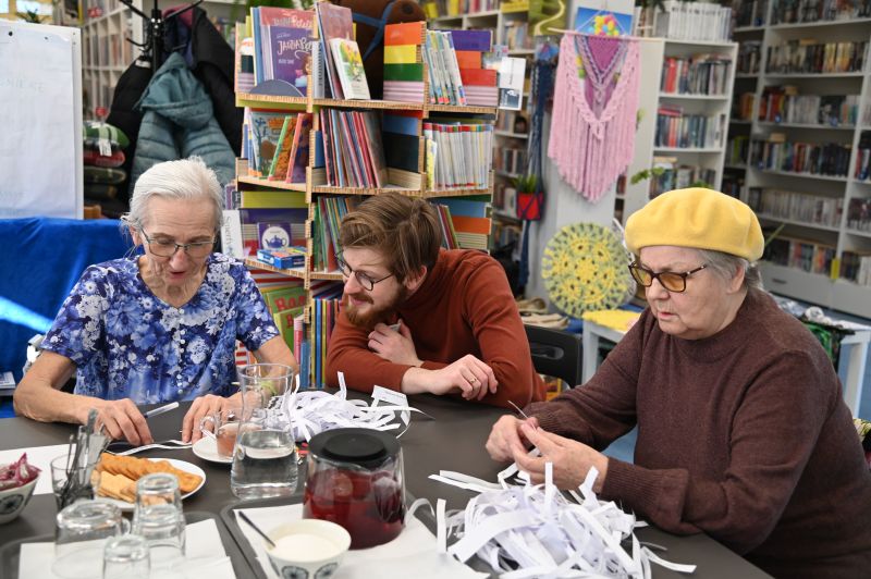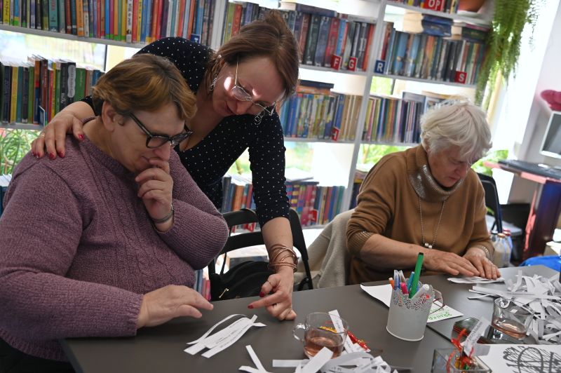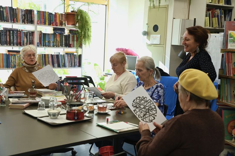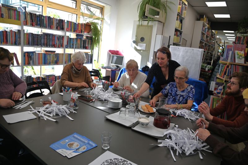 Była to okazja do rozmów o codziennych zmaganiach i wymiany doświadczeń, ale także ćwiczeń umysłowych i dobrej zabawy. Aleksandra Majewska, kierownik F nr 1, zaprezentowała ofertę biblioteki, opowiedziała o ciekawych książkach oraz prasie mogących zainteresować uczestników spotkania, zaprosiła ich również do, między innymi, językowych łamigłówek i „literackiego bigosu”, czyli układania wierszy z fraz i fragmentów pochodzących ze znanych utworów.
