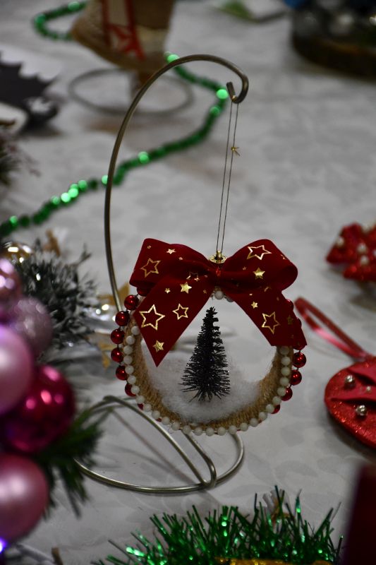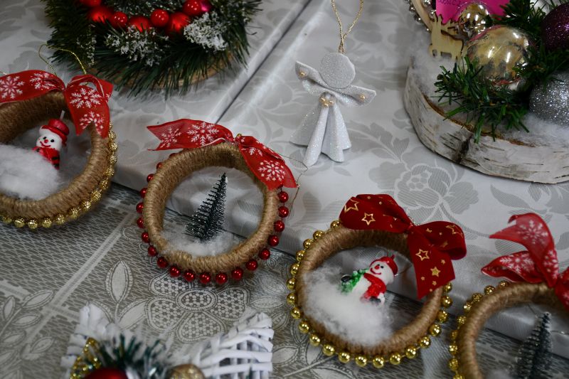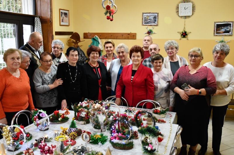 Rano stół w siedzibie przy ul. Norwida 2B zastawiony był pięknymi dekoracjami. Znalazły się wśród nich, między innymi: zawieszki na zielone drzewko wykonane ze sznurka, koralików i wstążki, kompozycje na drewnianej podstawce z gałązkami świerku, szyszkami i kolorowymi bombkami, drewniane choinki ze światełkami, anioły z pianki brokatowej, gwiazdy z wikliny papierowej, wieńce adwentowe z gwiazdą betlejemską, szydełkowe bałwanki, skrzaty z materiału. Wszystko kolorowe, zachwycające starannym wykonaniem i sercem, które autorki włożyły w przygotowanie ozdób.