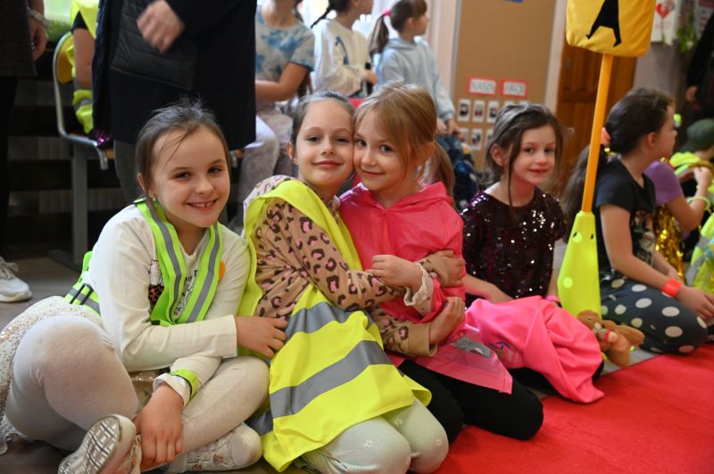 Po czerwonym dywanie przeszły modelki i modele, a ich kreacje naprawdę robiły wrażenie. Były, między innymi, kamizelki odblaskowe, kaski z ozdobami, święcące krawaty i okulary, peleryny i spódniczki z folii, odblaskowe bransoletki i opaski. Uczniowie kl. 1a zaśpiewali piosenkę pt. Przepisowy ruch drogowy, a słowa pierwszej zwrotki brzmiały tak: