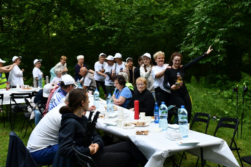 Po tej aktywności fizycznej wszyscy spotkali się przy stołach zastawionych pysznymi pierogami, owocami, chlebem ze smalcem i ogórkami. Można też było upiec kiełbaskę nad ogniskiem. Posileni, wypoczęci, oddali się tańcom i śpiewom pod przewodnictwem chłopaka z gitarą, czyli pana Andrzeja.
