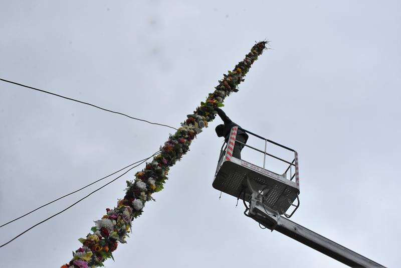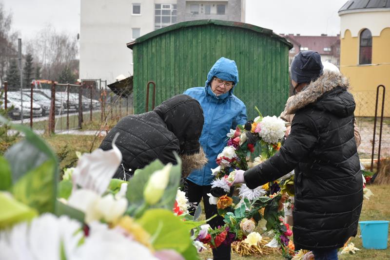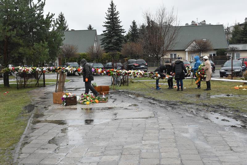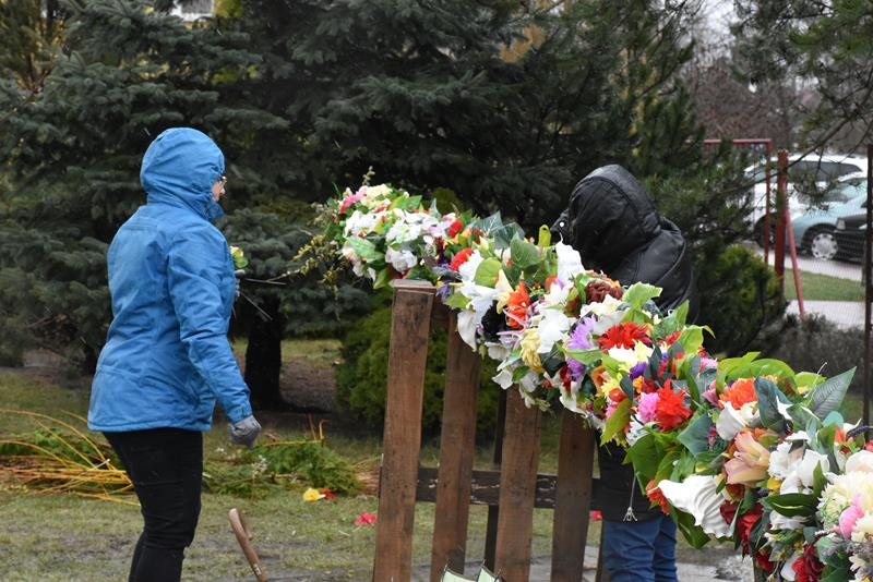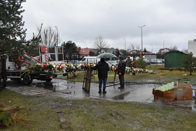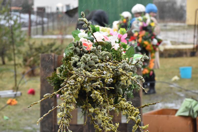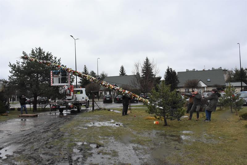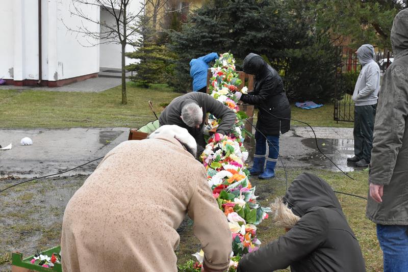 O godzinie 10.00 członkowie stowarzyszenia i chóru pojawili się w świątyni, by rozpocząć prace. I chociaż dzisiejsza pogoda nie rozpieszczała, chwilę po godz. 12.00, przed budynkiem parafii stanęła 13-metrowa palma wielkanocna, utworzona z kwiecistych łańcuchów liczących łącznie 70 metrów. Symbol świąt stanął też we wnętrzu świątyni. Łańcuchy i kwiaty, którymi przyozdobiono palmy powstały, m. in. podczas ubiegłotygodniowych warsztatów wielkanocnych.