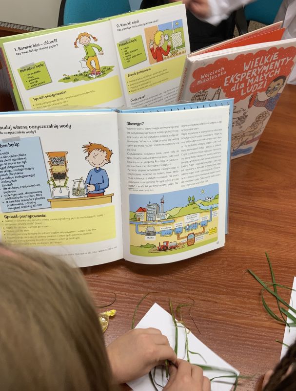 Pierwszoklasiści obejrzeli preparaty mikroskopijne, poznali budowę liści, obserwując je pod latarkami, a także wzięli udział w wielu ciekawych doświadczeniach przygotowanych na podstawie książek: „101 eksperymentów z roślinami”, „Wielkie eksperymenty dla małych ludzi” czy „101 eksperymentów z wodą”. Dzieci miały też okazję posłuchać fragmentu książki autorstwa Riha Susanne pt. „Cztery pory roku”.