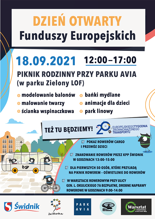 Sobota z kolei to dzień familijny. W parku Zielony LOF, sąsiadującym z obiektami Parku Avia, odbędzie się Dzień Otwarty Funduszy Europejskich, a w jego ramach – piknik rodzinny. Na świdniczan czeka wiele atrakcji. Dla najmłodszych przygotowano balony, malowanie twarzy, bańki mydlane oraz animacje. Będzie można skorzystać ze ścianki wspinaczkowej i parku linowego. Nie zabraknie też działań związanych z promocją rowerów jako środka transportu.