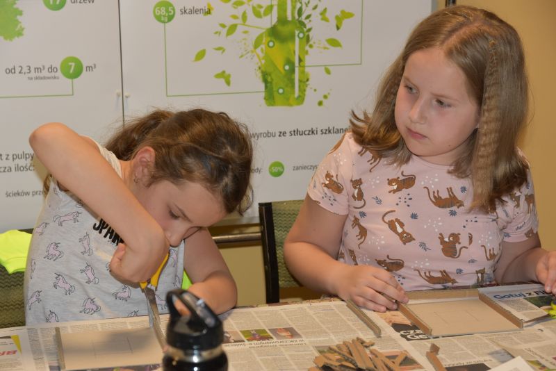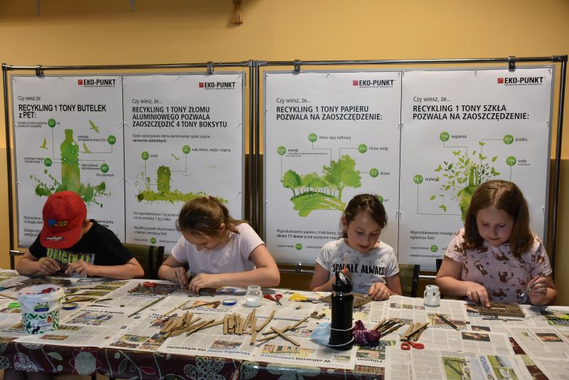Dzięki materiałom edukacyjnym, przekazanym przez firmę EKO-PUNKT Organizacja Odzysku Opakowań S.A., warsztatowicze poznali procesy recyklingu, uświadamiając sobie jak bardzo istotna jest świadomość ekologiczna w codziennych czynnościach. Podczas zajęć powstały mozaiki przestrzenne z drewna i papieru oraz wyjątkowe ramki z tektury falistej z pudełek przemysłowych. Na zakończenie działań uczestnicy otrzymali pamiątkowe zestawy ekologicznych gadżetów, wśród których znalazły się m.in. bawełniane torby, papierowe długopisy czy bambusowe kubeczki.