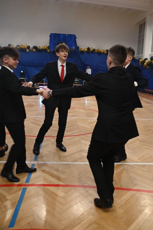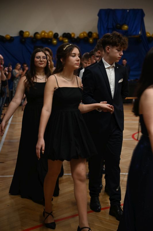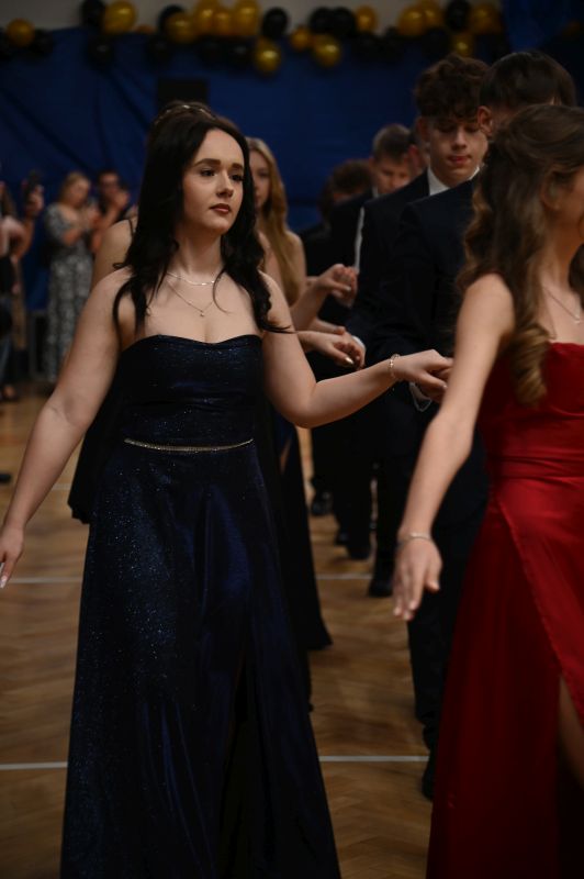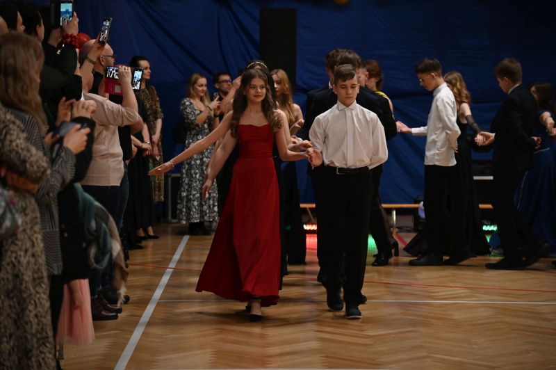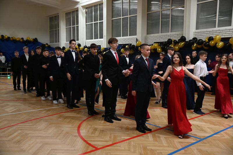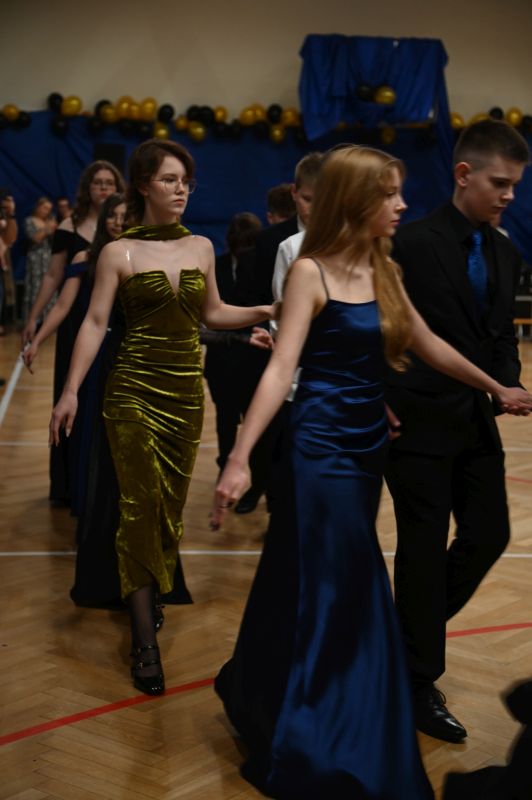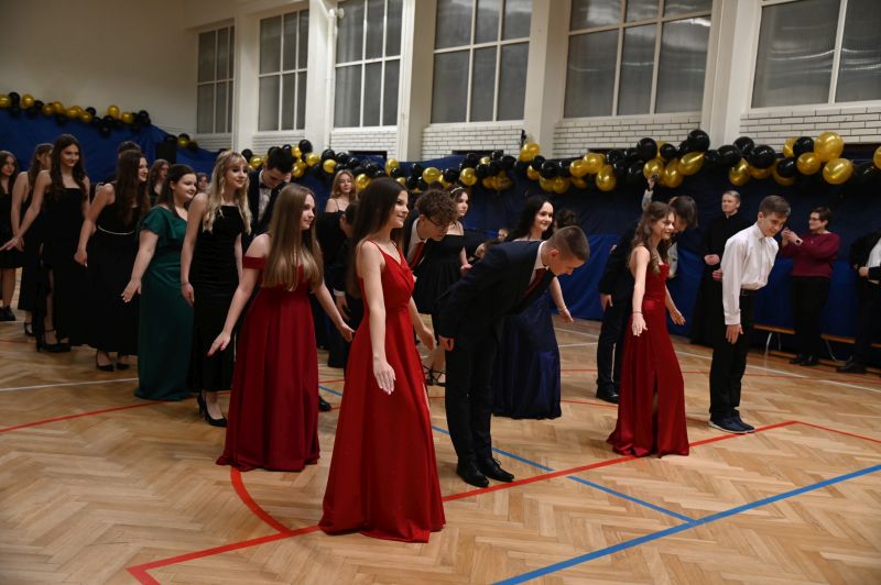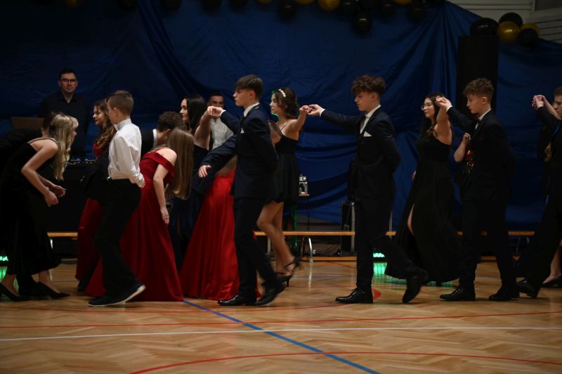 Uczniowie wkroczyli na parkiet dostojnym krokiem. Niektórzy z powagą, inni z uśmiechem na twarzy wykonywali figury staropolskiego tańca, do wykonania którego przygotowały ich Daria Gnieciak i Natalia Orzeł, nauczycielki wychowania fizycznego. Tradycyjnie w pierwszych taktach towarzyszyli im dyrektor Leszek Kalicki i wicedyrektor Anna Owsicka-Mazur.