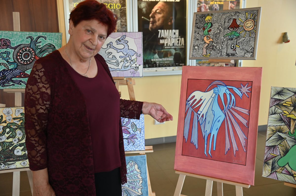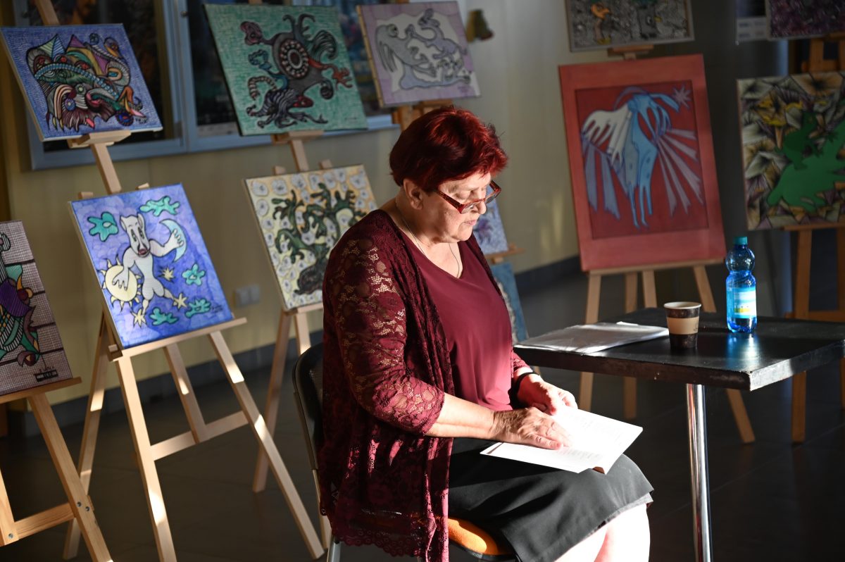 – Będę mówiła o swojej twórczości, która podoba mi się z powodu, że jest piękna, ale że jest moja i inna, że pobudza moje szare komórki do myślenia, dzięki czemu mogę tworzyć coś oryginalnego. Obrazy dzisiaj prezentowane są częściowo przeglądem dotychczasowej twórczości, częściowo nowymi pracami. Wszystkie są efektem mojej zabawy kolorami. Przeczytam też kilka swoich wierszy, które są zwyczajne, proste, ale oddają stan mojej duszy – powiedziała pani Anna Witek przed rozpoczęciem spotkania.