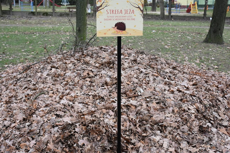 Każde miejsce bytowania jeży jest oznaczone specjalną tabliczką, informującą mieszkańców, kto mieszka pod kopułą z liści i dlaczego nie należy jej niszczyć. To również sygnał dla osób dbających o czystość Świdnika, by nie zamiatać pryzm z listowia.