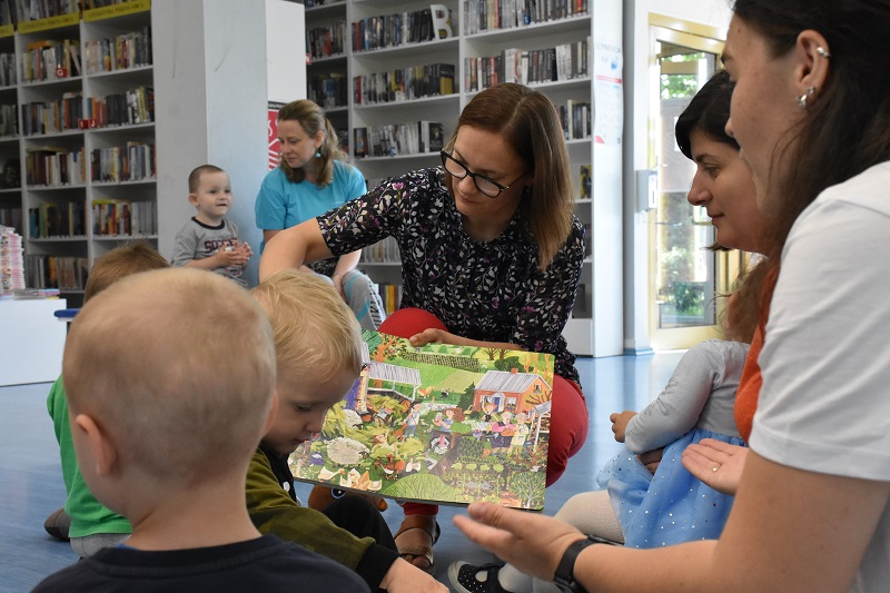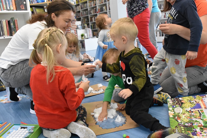 Najmłodsi mieli okazję zapoznać się z czytelnią, zobaczyć jakie pozycje znajdują się w jej zbiorach oraz wziąć udział w wielu ciekawych aktywnościach. Wspólne oglądanie książek, nauka polskich i ukraińskich nazw zwierząt wiejskich oraz domowych czy kolorowanki to tylko niektóre z przygotowanych zadań. Maluchy wraz ze swoimi paniami wykonały również przestrzenną pracę plastyczną – owcę z waty.