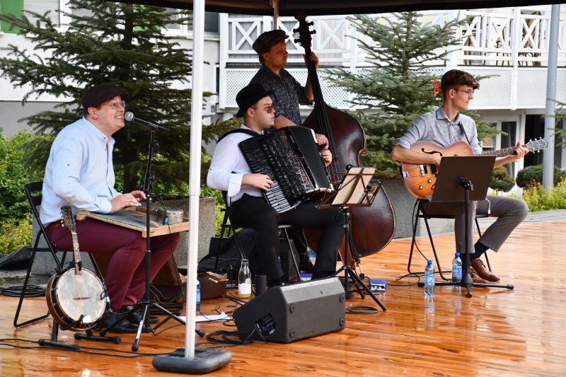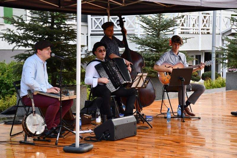 Mnóstwo chętnych do wywijania na parkiecie lub choćby tylko obserwowania innych, mimo chwilowych przerw spowodowanych opadami deszczu, zgromadziła potańcówka z Maciejową Kapelą w składzie: Antoni Kuncewicz (bandżola, tara, wokal), Franio Miętus (akordeon, bandżola), Stefan Tyczka (gitara) i Stanisław Zielonka (kontrabas). Grupa, stylem nawiązująca do dawnych ulicznych cwaniaków, jest dobrze u nas znana i wielce lubiana, bo przygrywała nam już kilka razy. Za każdym z taką samą energią, porywając muzycznymi opowieściami o międzywojennej Polsce, a bohaterami wykonywanych przez zespół utworów są głównie Warszawa i Lwów.