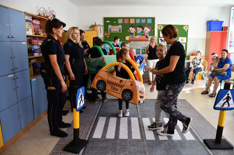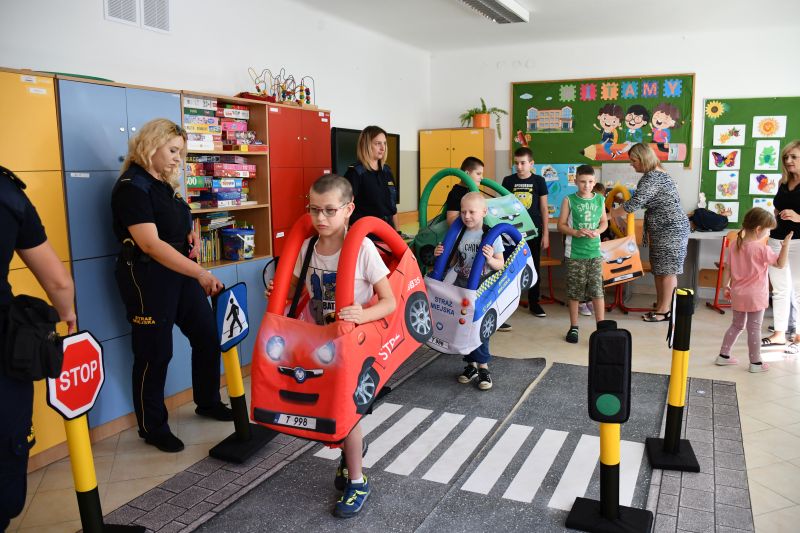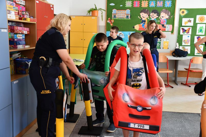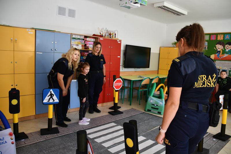 Aby ułatwić zajęcia i odpowiednio zilustrować omawiane zagadnienia, strażniczki miejskie Marta Gardziała, Dominika Gruda i Malwina Socha przyniosły ze sobą ciekawe pomoce naukowe. Dzięki mobilnemu miasteczku ruchu drogowego podopieczni SOSW mogli przypomnieć sobie zasady przechodzenia przez przejście dla pieszych, a także znaczenie poszczególnych znaków drogowych i kolorów w sygnalizacji świetlnej.