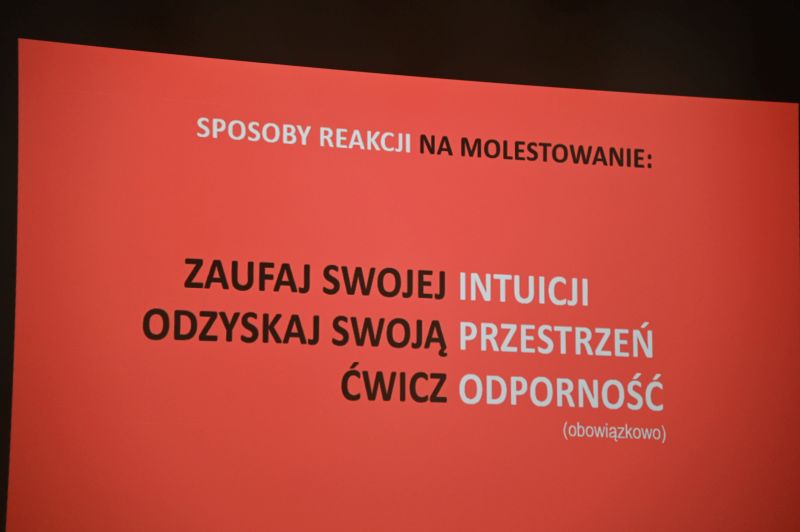 Kolejny punkt to była prezentacja „StandUp. Sprzeciw się molestowaniu w miejscach publicznych”. Przygotowała ją Iza Gawęcka, trenerka samoobrony i asertywności WenDo, certyfikowana trenerka Stowarzyszenia Trenerskiego Organizacji Pozarządowych, animatorka kultury. Przedstawiła skutki takiego molestowania, czyli: lęk, depresja, PTSD (psychologiczne), ograniczona mobilność, odejście z pracy, opuszczenie szkoły lub pracy, zmiana miejsca zamieszkania (społeczne i finansowe), jakość życia (wspólnotowe) i opowiedziała o tym, w jaki sposób możemy zareagować, kiedy jesteśmy jego świadkami: dekoncentrujemy napastnika, dołączamy do sytuacji innych świadków, dokumentujemy zdarzenie, dajemy wsparcie osobie molestowanej, dochodzimy do głosu. Co zrobić, kiedy sami jesteśmy ofiarami? Przede wszystkim nie możemy mieć poczucia winy i reagować: zaufać swojej intuicji, odzyskać swoją przestrzeń i ćwiczyć odporność. Zainteresowani mogą zajrzeć na stronę www.izagawecka.pl.