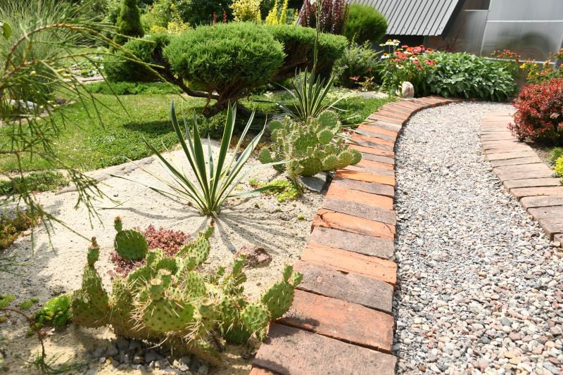 Działka państwa Mazurów to prawdziwy park krajobrazowy, ale w wersji mikro. Kręte ścieżki wijące się wśród zieleni zostały wyłożone drobnym żwirem i czerwonymi cegłami, pochodzącymi z rozbiórki starego domu. Na powierzchni 300 metrów kwadratowych można podziwiać roślinność pustynną z przepięknie kwitnącymi jukami i opuncjami. Jak się okazuje, gatunki te całkiem dobrze znoszą nasze warunki zimowe. Zaraz obok, wznoszą się różne rodzaje traw ozdobnych oraz charakterystycznie przyciętych drzewek, które przywołują skojarzenia podzwrotnikowej sawanny. Nie brakuje też roślin skalnych i ciekawych okazów charakterystycznych dla naszego klimatu – drzew, na przykład brzozy i wiązu, mchów i paproci. Wszystko ze sobą współgra barwami i kształtami. – Ogrodową przestrzeń aranżujemy zgodnie razem. Tak było w przypadku kaktusów, które kupiliśmy na targu. Uznaliśmy też, że w naszej zielonej oazie nie funkcjonuje pojęcie szkodnik, bo wszystkie stworzenia mają prawo do życia, nawet gdy pogryzają rośliny.