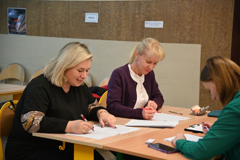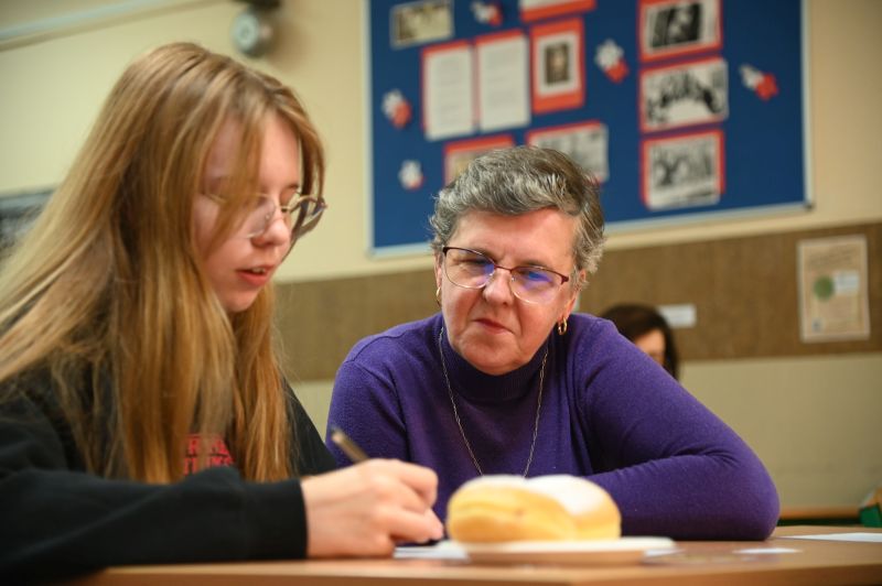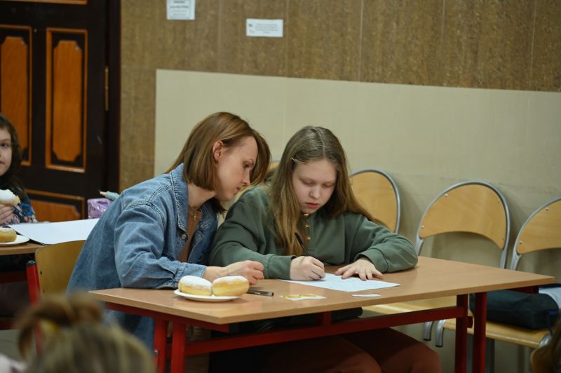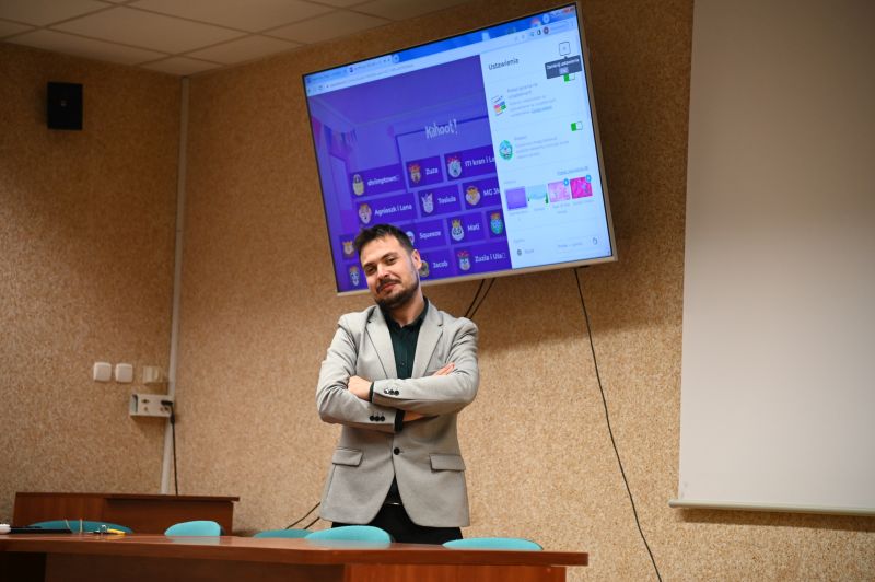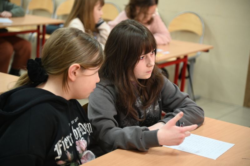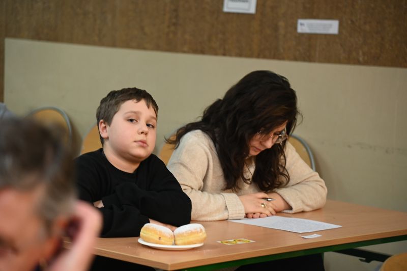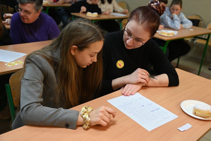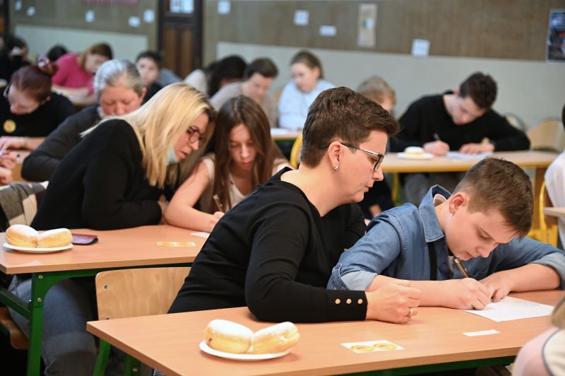 Później szkolny korytarz wypełnił się emocjami i skupieniem. Tekst dyktanda – pełen ortograficznych pułapek, nie tylko z „ó” i „u”, „rz” i „ż” – dotyczył walentynek, piątku trzynastego oraz …dinozaurów i wymagał nie lada koncentracji oraz współpracy w parach. Uczestnicy szeptem konsultowali trudniejsze wyrazy, wspierali się i motywowali do działania. Po napisaniu jednak chyba wszyscy odetchnęli z ulgą i udali się do auli, gdzie w przerwie na sprawdzanie prac Jakub Płachata, nauczyciel geografii, zaprosił ich do udziału w quizach online na temat flag i stolic europejskich krajów. Tu emocje były równie wielkie, jak podczas zmagania z językowymi pułapkami.