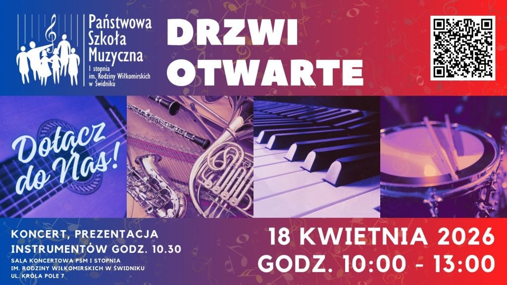 PSM I st. zaprasza wszystkich chętnych 18 kwietnia, w godz. 10.00-13.00. Świdniczanie będą mieli szansę zobaczyć jak funkcjonuje placówka, zapoznać się z jej ofertą edukacyjną i porozmawiać z nauczycielami. Odbędzie się również koncert, a uczniowie opowiedzą o instrumentach, na których uczą się grać. Są to: fortepian, skrzypce, wiolonczela, kontrabas, gitara, flet, klarnet, saksofon, trąbka, akordeon i perkusja.