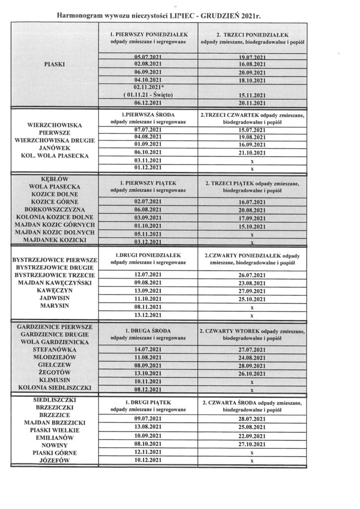 Terminarz wywozu odpadów opublikował dzisiaj Urząd Miejski w Piaskach. Będzie obowiązywał od lipca do grudnia tego roku.