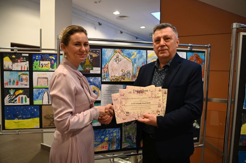 Podczas spotkania Marcin Dmowski, Łukasz Reszka, Beata Kowalczyk, dyrektor ZP nr 2, i Barbara Hajkowska-Pirek wręczyli nagrody laureatom konkursów plastycznych „W żłobie leży, któż pobieży”, nad którymi patronat honorowy sprawował burmistrz Waldemar Jakson.