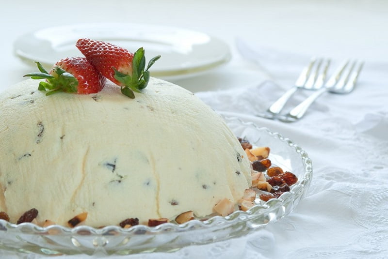 Bakalie moczymy w wodzie lub rumie. Jeśli mamy morele suszone i śliwki, należy je pokroić.1 laskę wanilii przecinamy na pół, ziarna dodajemy do 2 l tłustego mleka, które należy zagotować. Do gotującego mleka wlewamy1/2 l kwaśnej śmietany, wymieszanej z 6 jajkami i sokiem z ½ cytryny. Całość gotujemy, aż odzieli się ser od serwatki. Durszlak wykładamy gazą lub ściereczką i odcedzamy ser (serwatkę możemy na chwilę zachować). Mocno wyciskamy ser i odstawiamy do ostygnięcia. 250 g miękkiego masła ubijamy mikserem z ¾ szkl. cukru pudru. Dodajemy porcjami ostudzony ser i ucieramy na jednolity krem. Dodajemy odsączone bakalie, mieszamy i przekładamy ponownie do durszlaka lub specjalnej formy z dziurkami wyłożonej gazą lub ściereczką zmoczoną w serwatce. Ugniatamy krem i zawijamy. Wstawiamy na noc do lodówki. Następnego dnia przykładamy talerz i odwracamy paschę. Ściągamy gazę lub ściereczkę. Dekorujemy bakaliami.