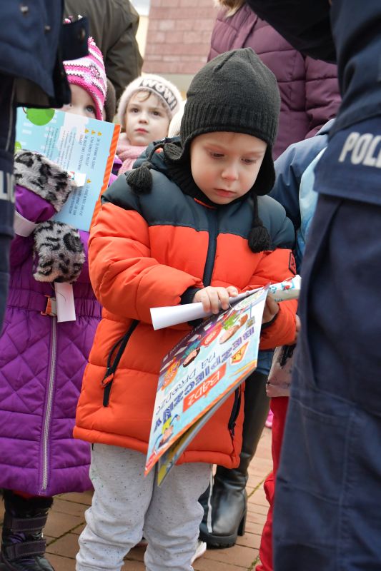 Dzieci otrzymały podarunki od organizatorów akcji książeczki „Bądź bezpieczny na drodze”, słodycze i papierowy model radiowozu do złożenia.