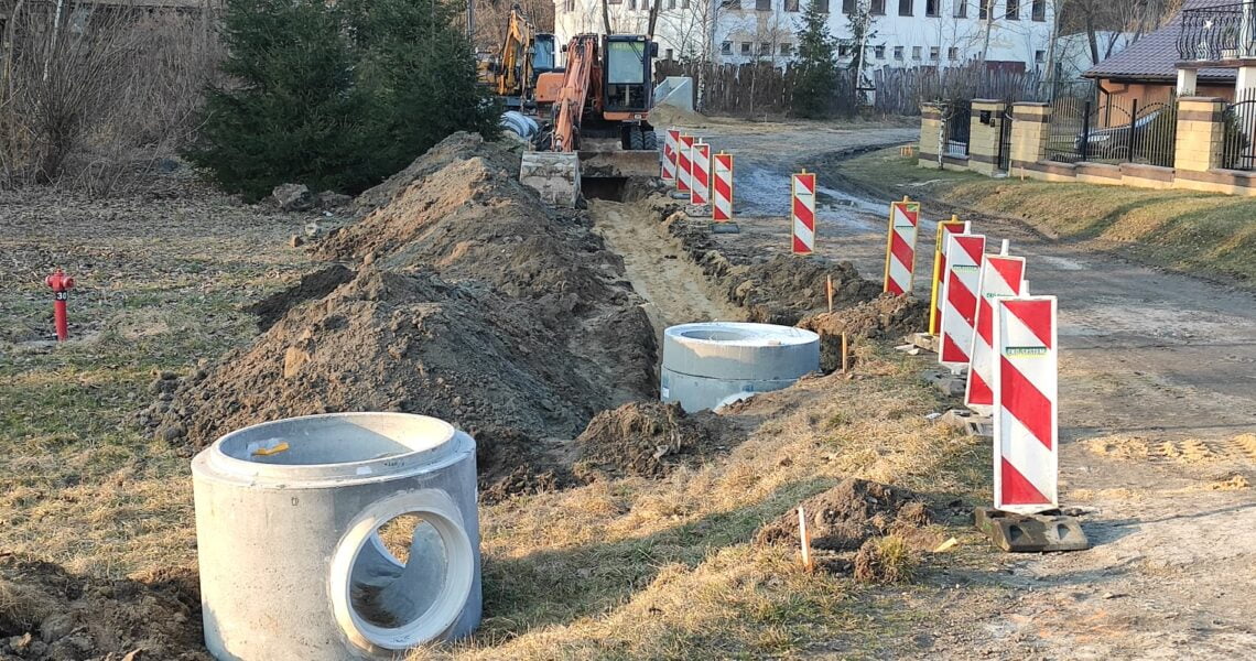 – Teraz trwają prace przy montażu kanalizacji burzowej – studni rewizyjnych – informuje Urząd Gminy Rybczewice.