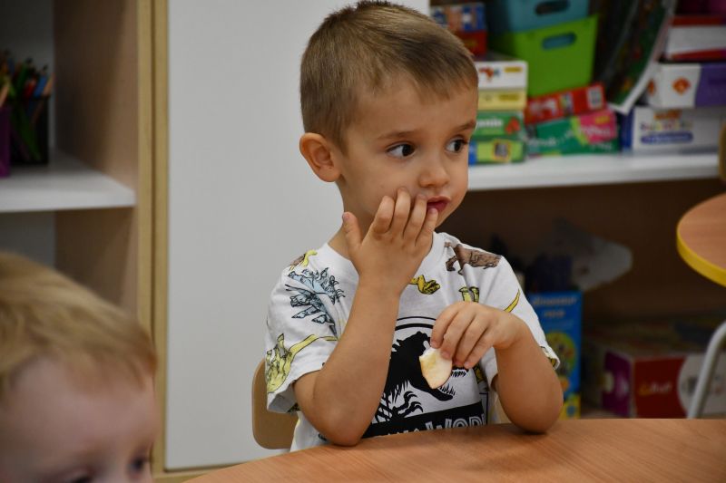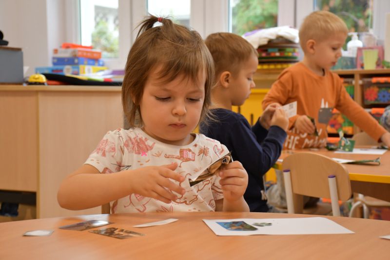 – Zajęcia ruchowe mamy codziennie rano, sensorykę dwa razy w tygodniu. Dzieci muszą mieć dużo aktywności fizycznej, więc bawimy się piłkami, skaczemy, pokonujemy przeszkody. Pracujemy w ten sposób nad dużą motoryką, czyli zręcznością ruchową i sprawnością prawie całego ciała, a co za tym idzie, rozwijamy układ nerwowy, koordynację ruchową oraz koncentrację uwagi. Usprawniamy też małą motorykę – sprawność dłoni i palców – wyjaśnia Violetta Ślepaczuk, wychowawczyni 3-latków, którymi opiekują się również panie Kinga Chinek i Anna Majewska.