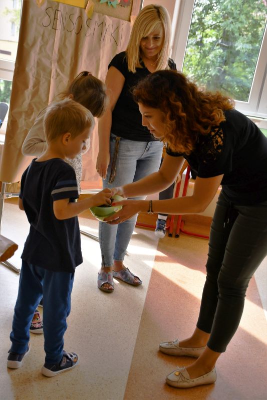 – W tym tygodniu planujemy jeszcze zajęcia z ruchu rozwijającego Weroniki Sherborne, które wprowadziliśmy w naszym przedszkolu jako innowację – dodają panie Dorota i Dominika. – Dzięki nim dzieci, w rytm muzyki relaksacyjnej, uczą się bliskości, koordynacji, przytulania, ale też dzielenia przestrzeni z innymi osobami. Metoda ta stymuluje ich rozwój emocjonalny, społeczny i poznawczy. W połączeniu ze spotkaniami „SensoSmyków” na pewno przyniosą wiele korzyści naszym podopiecznym.