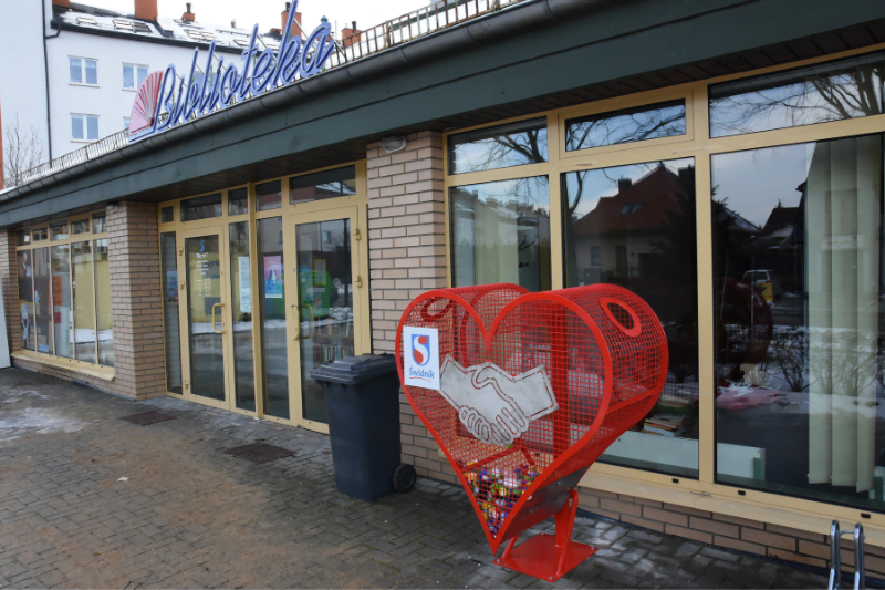 Metalowy pojemnik w kształcie serca, do którego możecie wrzucać plastikowe nakrętki został dzisiaj zamontowany przed wejściem do Filii nr 1 Miejsko-Powiatowej Biblioteki Publicznej, przy ul. Ratajczaka.