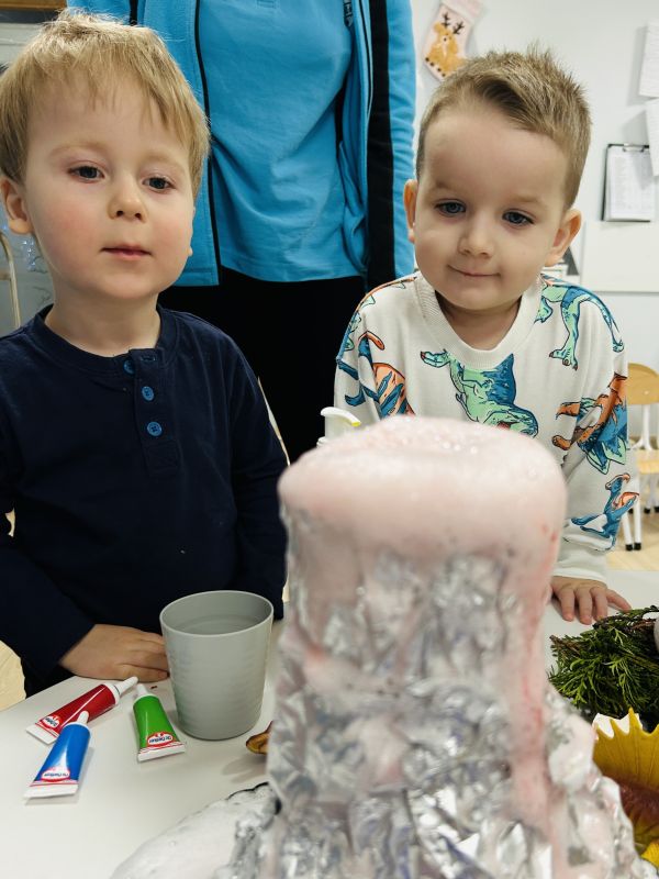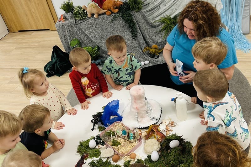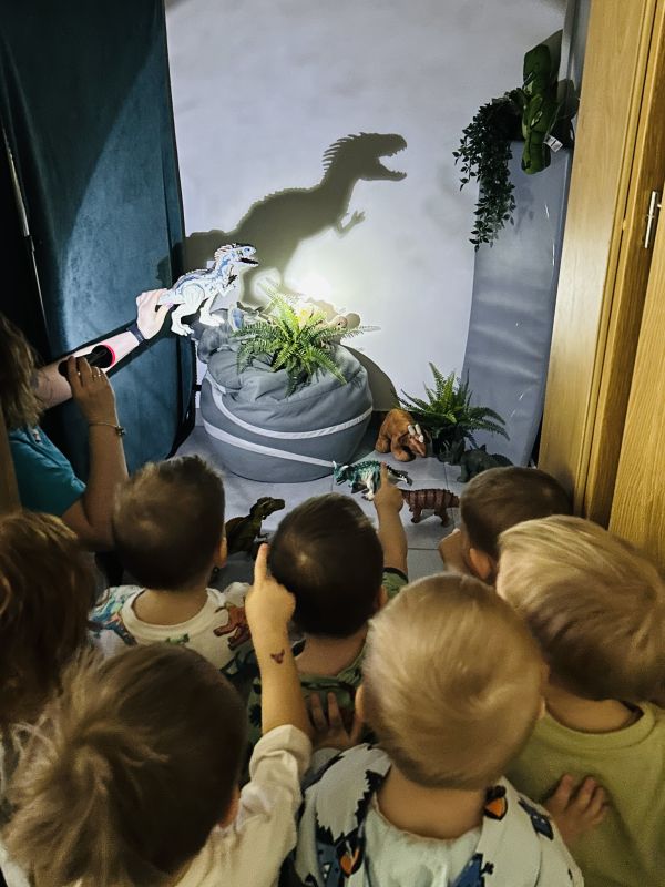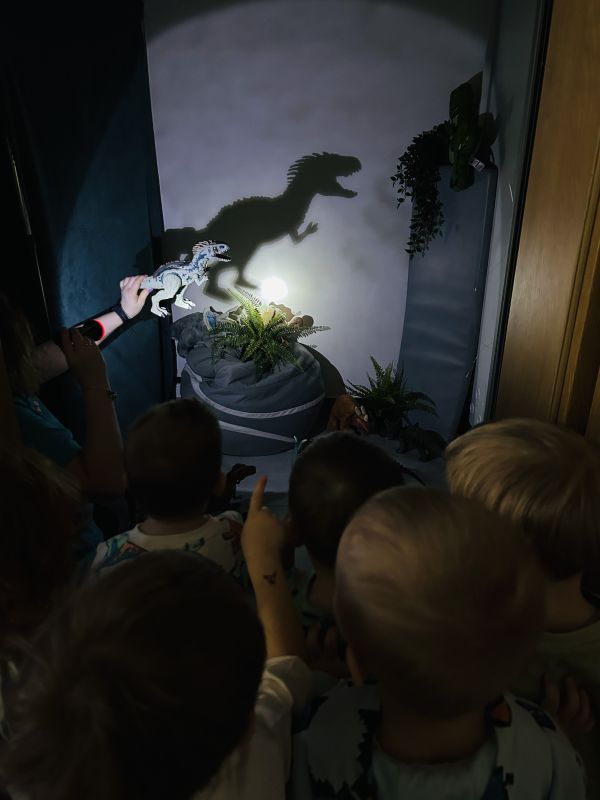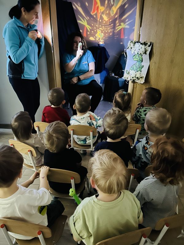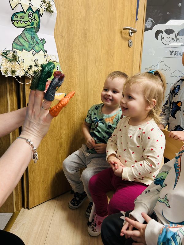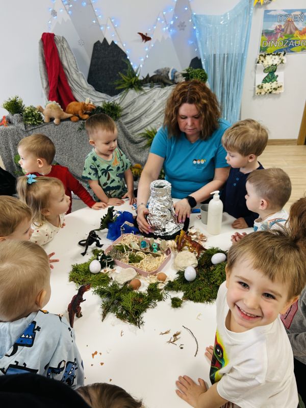 Maluszki przeniosły się do prehistorycznego świata dzięki teatrzykowi cieni oraz ruchomemu, papierowemu plakatowi przedstawiającemu wyklucie dinozaura. Dużo śmiechu przyniósł paluszkowy teatrzyk, bo pacynki w kształcie dinozaurów łaskotały małe noski publiczności. Podczas eksperymentów dzieci rozbijały „jajka”, w których odkrywały zamrożone figurki gadów, a później, razem z wychowawczyniami, zrobiły wulkaniczne doświadczenie z sodą i octem. Przygotowały też masę solną, odciskały w niej ślady figurek i ozdabiały prace skorupkami jajek. Było też oglądanie przestrzennych książeczek, a na zakończenie pamiątkowe zdjęcia.