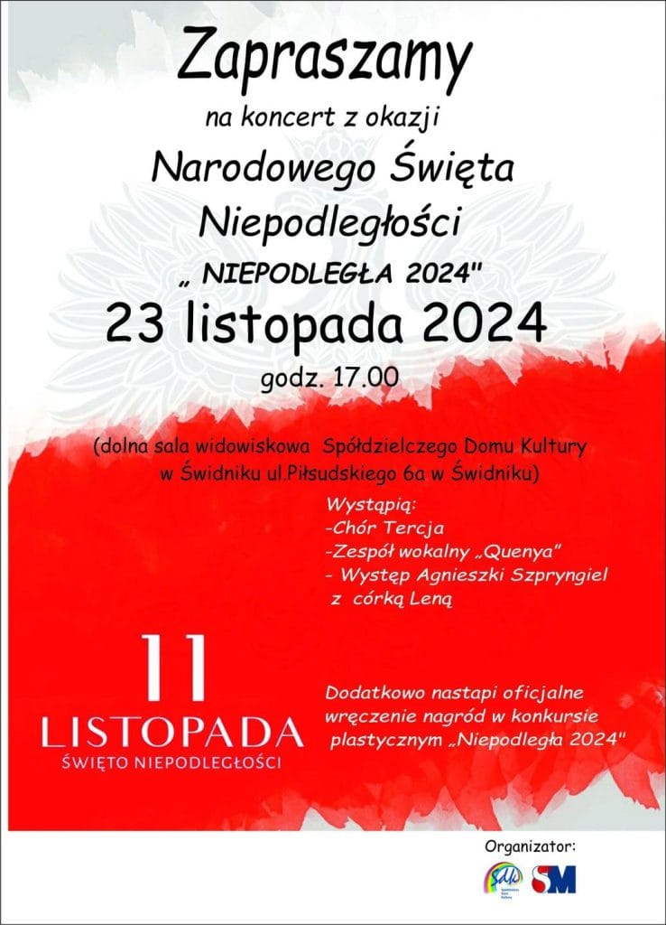 Publiczność obejrzy występy: Chóru Tercja, zespołu wokalnego Quenya oraz Agnieszki Szpryngiel z córką Leną. Kolejnym punktem spotkania będzie wręczenie nagród laureatom konkursu plastycznego „Niepodległa 2024”.