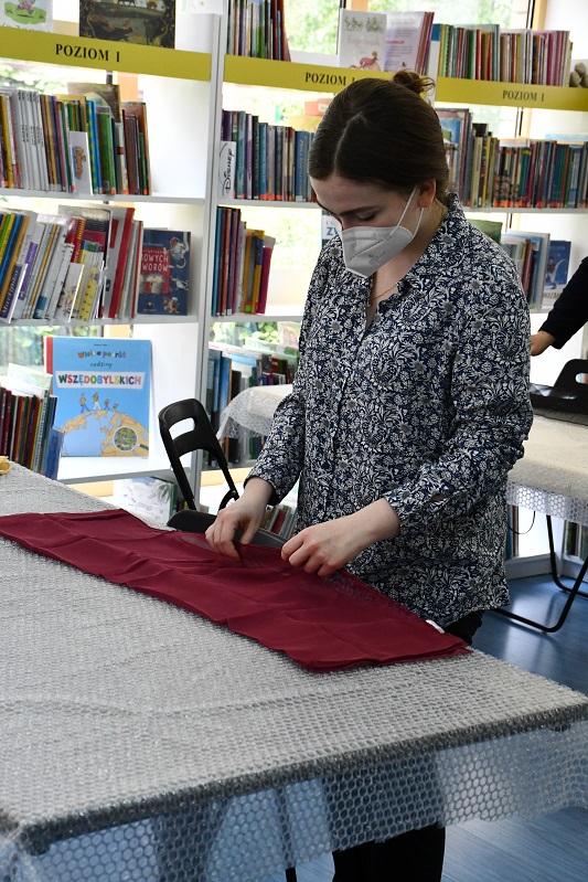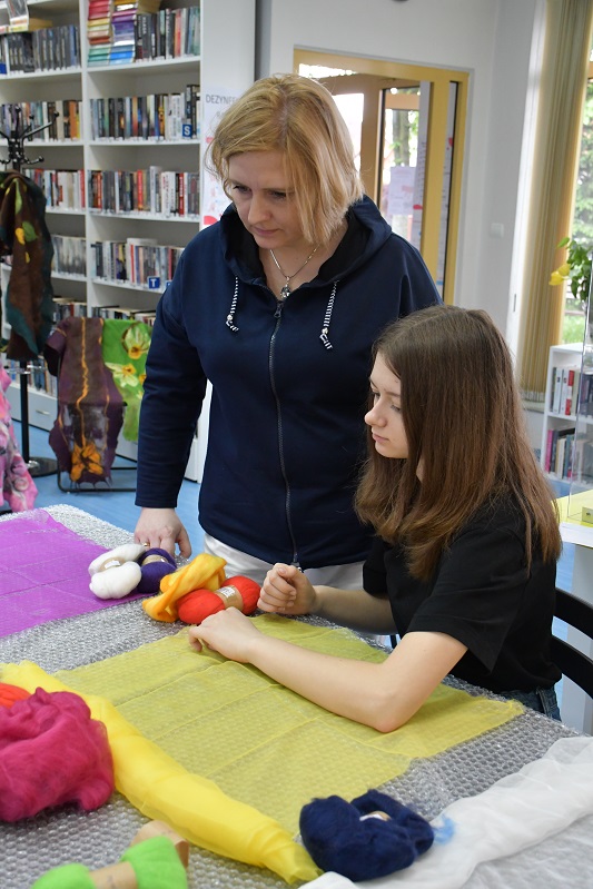 Aby książkowa teoria nie pozostała jedynie teorią, uczestniczki spróbowały sił w filcowaniu na jedwabiu. Ich przewodniczką w tej niełatwej i wymagającej wiele cierpliwości sztuce była Agnieszka Grela.