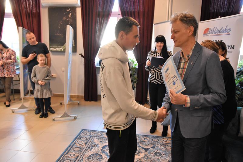Zebranych w galerii biblioteki artystów, ich przyjaciół, rodziny, nauczycieli oraz wychowawców przywitał również Romuald Gumienniak, członek zarządu powiatu świdnickiego: – Bardzo się cieszę, że bierzecie udział w tego rodzaju konkursie i że widzicie tą różnorodność. Możemy się trochę od siebie różnić, ale najważniejsze jest to, żebyśmy byli wobec siebie życzliwi.