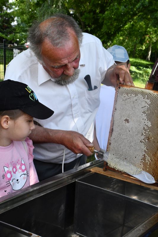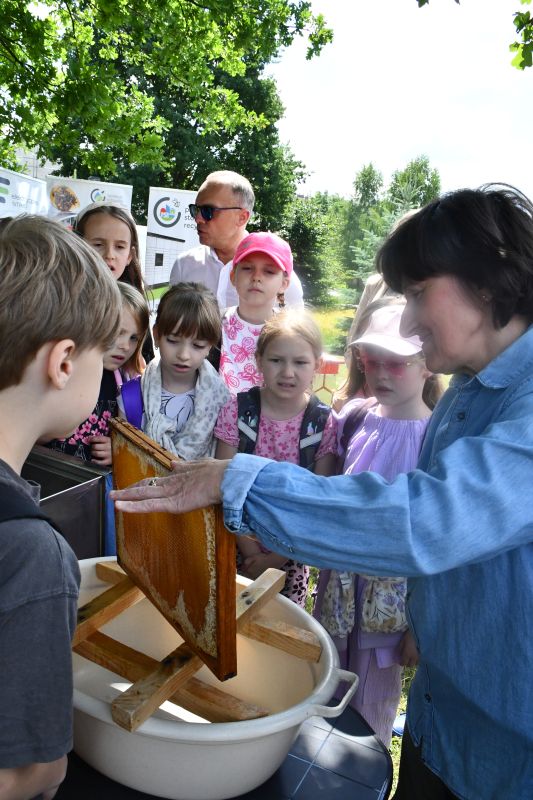 Krzysztof Kukawski, zawodowy pszczelarz, który dba o dobrostan owadów, a także przeprowadza miejskie miodobrania, razem z żoną Marią zademonstrował poszczególne etapy powstawania miodu, między innymi jego odsklepianie i wirowanie.