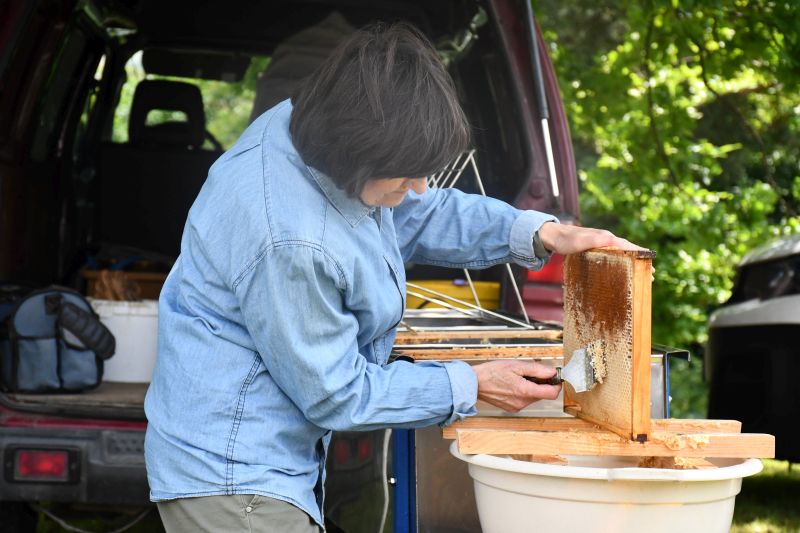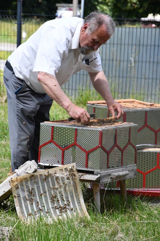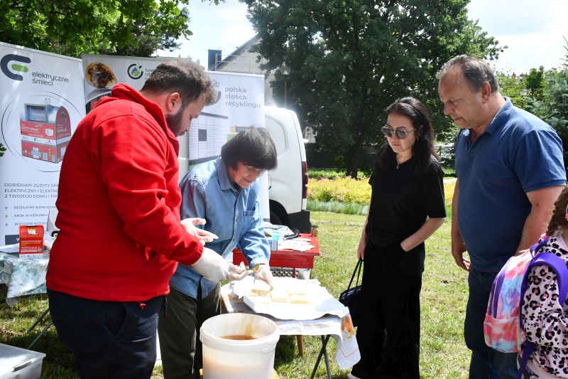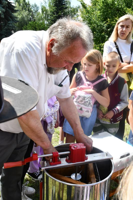 Krzysztof Kukawski, zawodowy pszczelarz, który dba o dobrostan owadów, a także przeprowadza miejskie miodobrania, razem z żoną Marią zademonstrował poszczególne etapy powstawania miodu, między innymi jego odsklepianie i wirowanie.