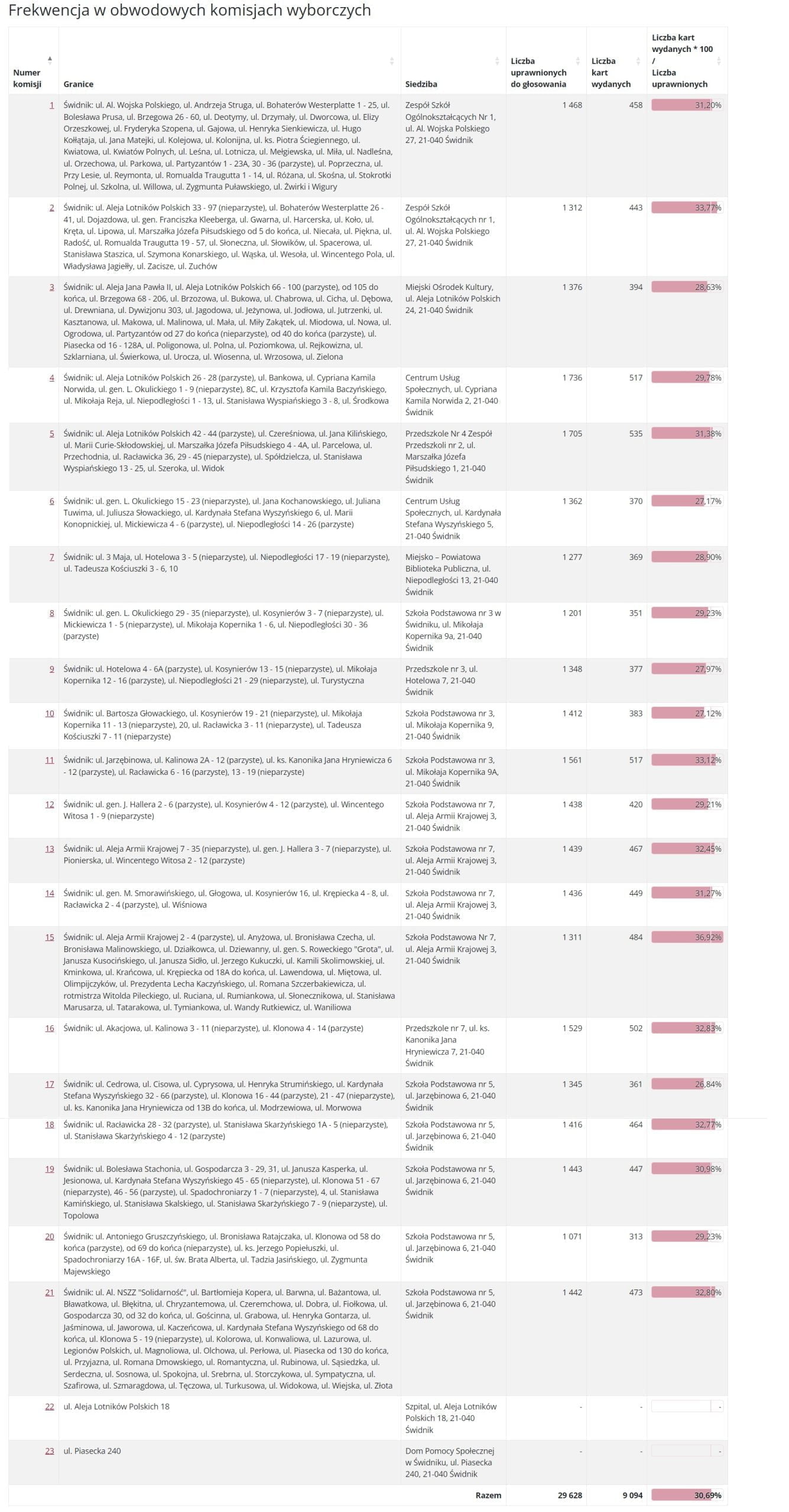 Najwyższą frekwencję odnotowano w OKW nr 15 – 36,92%, OKW nr 2 – 33,77% i OKW nr 11 – 33,12%.