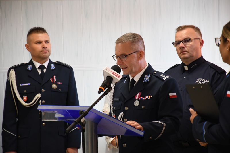 Insp. Jerzy Czebreszuk odczytał także list okolicznościowy od Komendanta Wojewódzkiego Policji w Lublinie nadinsp. Artura Bieleckiego. Skierował również kilka słów do zgromadzonych gości: – Mam ogromny zaszczyt uczestniczenia w dzisiejszym święcie. Korzystając z okazji chcę przyłączyć się do życzeń i podziękować wszystkim za każdy dzień pełnionej służby. Za to, co robicie dla powiatu świdnickiego i dla całego województwa lubelskiego. Jest to najbezpieczniejsze województwo w kraju – dzięki waszej pracy przez wszystkie lata. W naszej służbie każdy dzień jest inny. Każdego dnia napotykamy na nowe wyzwania i interwencje, nie ma schematu, a to wiąże się z odpowiedzialnością. Z jednej strony trzeba być „twardym”, z drugiej – empatycznym. Wy właśnie w taki sposób podchodzicie do służby, za co bardzo wam dziękuję. W zakresie bezpieczeństwa powiatu stajecie zawsze na najwyższym poziomie.