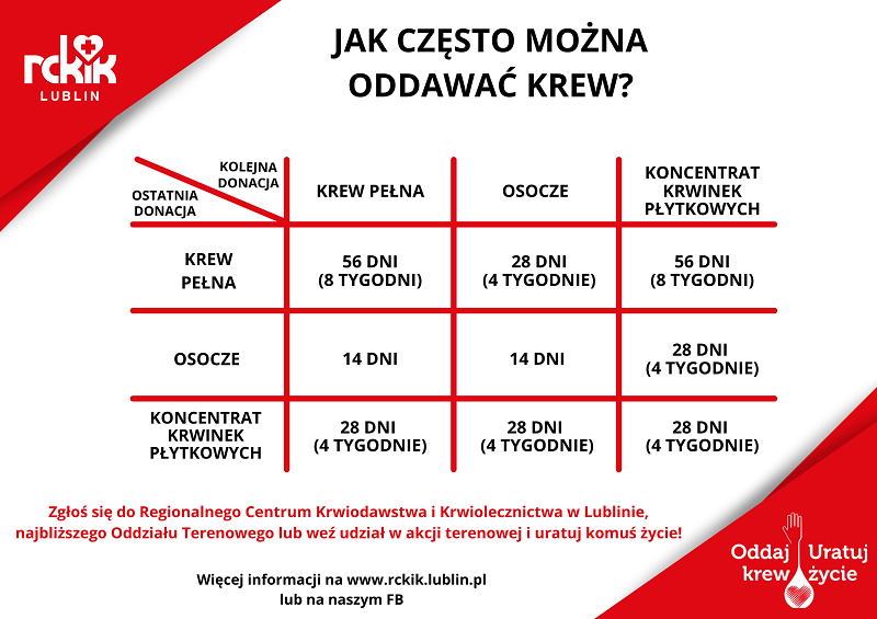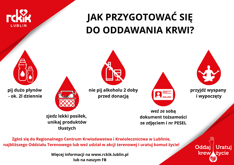 RCKiK zaprasza do swojej siedziby w Lublinie, przy ul. Żołnierzy Niepodległej 8 lub do najbliższego Terenowego Oddziału RCKiK. Rejestracja dawców pod numerami telefonów: 81 442 10 40, 600 471 297.