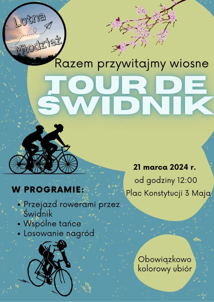 To inicjatywa Stowarzyszenia „Lotna Młodzież”, które zaprasza wszystkich chętnych na wspólne przywitanie wiosny. 21 marca, o godz. 12.00, z placu Konstytucji 3 maja wyruszy parada na dwóch kółkach, by przejechać ścieżkami rowerowymi Świdnika (ul. Niepodległości, al. Armii Krajowej, ul. Racławicka, al. Lotników Polskich, ul. Niepodległości) i szukać oznak najpiękniejszej pory roku.