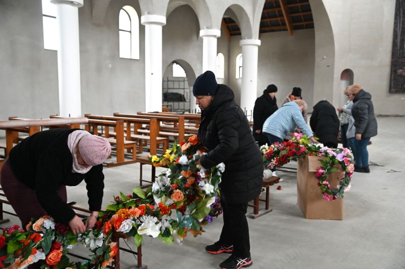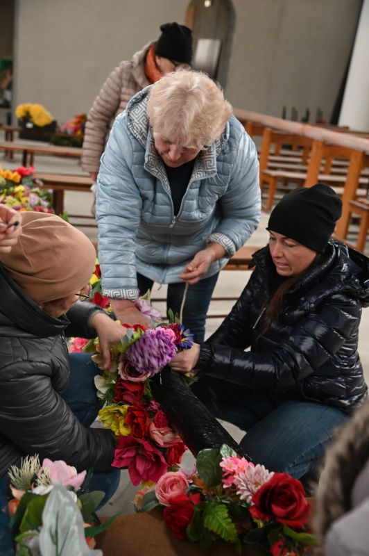 Dzisiaj rano, chociaż padał obfity deszcz, przystąpiono do montażu symbolu Niedzieli Palmowej. Potrzebny był podnośnik i pomoc kilkunastu osób, bo tak wysoka palma wymagała również specjalnych mocowań. Mniejsza, około 6-metrowa, ale równie pięknie ozdobiona, stanęła w kaplicy.