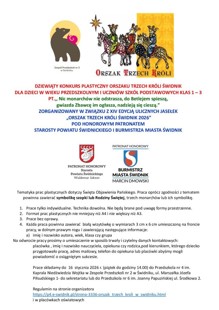 Styczniowemu wydarzeniu tradycyjnie już towarzyszą konkursy plastyczne dla przedszkolaków i uczniów klas 1-3. Prace należy dostarczyć do 16 stycznia 2026 r., do Zespołu Przedszkoli nr 2. Regulaminy będą dostępne na profilach Facebookowych Orszaku Trzech Króli Świdnik.