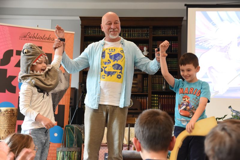 – Dokładnie tak było. Cieszę się, że w końcu tu przyjechałem. Dziękuję za zaproszenie i że tu przyszliście. Nazywam się Łukasz Wierzbicki i dziś chciałbym wam zdradzić kilka tajemnic. Przedstawię bohaterów moich książek. Powiem, kim był Kazik, jak to było z tym Misiem Wojtkiem. To będzie szalone spotkanie, jakiego jeszcze nie było – odpowiedział bohater spotkania.