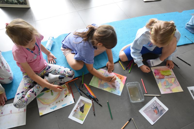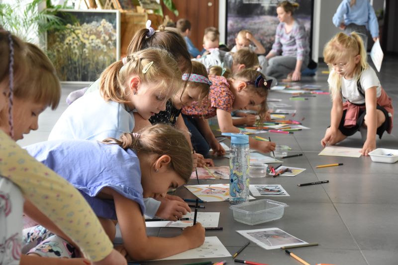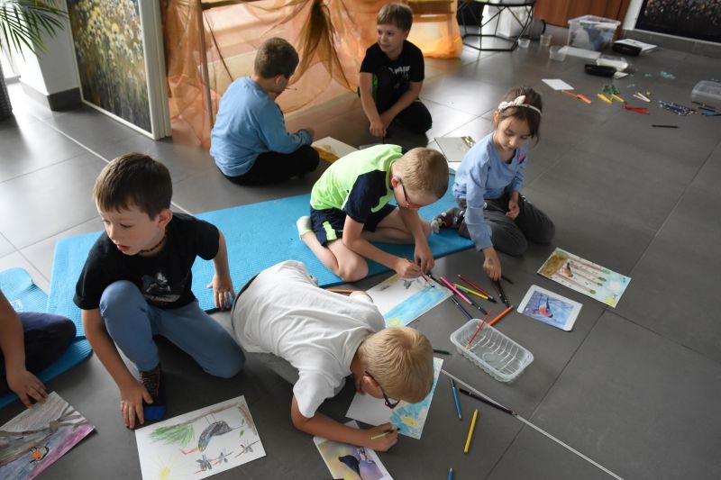 Druga część warsztatów dała zerówkowiczom okazje, by stworzyć własne prace przedstawiające ptaki, przy użyciu kredek akwarelowych, które następnie rozmyli za pomocą mokrych pędzelków. Powstały bardzo kolorowe i wyjątkowe akwarele, uwieczniające to, jak najmłodsi widzą skrzydlatych mieszkańców Polski.