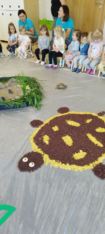 Wyjątkowe spotkanie odbyło się w najmłodszej grupie „Zagroda”. Maluchy poznały wygląd, sposób odżywiania i zwyczaje różnych gatunków tych sympatycznych gadów. Panie opiekunki, poprzez zajęcia sensoryczne i edukacyjne, na przykład układanie sylwetki żółwia z płatków kukurydzianych i czekoladowych kulek czy zabawę z wodą, wzbogaciły przyrodnicze zainteresowania dzieci, ale pokazały również, że należy dbać o wszystkie zwierzęta. Maluszki z ogromną radością i zaciekawieniem brały udział w lekcji, a największą niespodzianką był dla nich żółw Franek, który odwiedził „Zagrodę”.