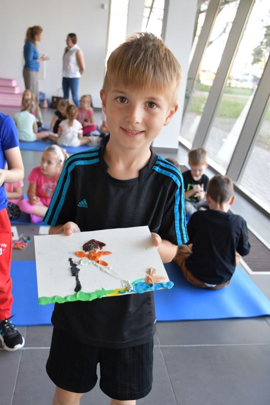 Jak się okazuje, tym tworzywem również można rysować. 6-latki bardzo chętnie wzięły się do pracy, a z rozcieranej na kartonie plasteliny wyczarowały przepiękne dzieła. Powstały kwietne łąki, tęcza, anioł, kotki, pieski, jednorożce, dinozaury, a nawet piłkarze na boisku i portret prowadzącej zajęcia.