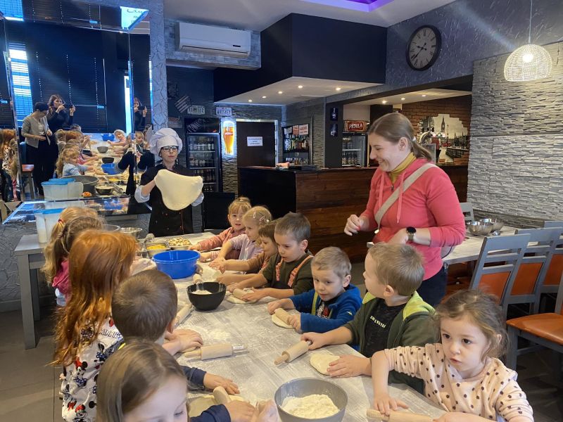 W ramach spotkania „Cała Polska Czyta Dzieciom” przedszkolaki z zaciekawieniem słuchały znanej bajki „Pinokio” włoskiego autora Carla Collodi oraz poznały lalkę teatralną wykonaną z drewna – marionetkę. Przez cały „włoski tydzień” wykonywały wiele prac plastycznych związanych tematycznie z realizowanym tematem, np. Koloseum z pudełek po zapałkach, gondolę metodą origami, maski karnawałowe, rysowały Pinokia oraz tworzyły makaronowe kompozycje. Zajęciom towarzyszyła zabawa z elementami masażu „Włoska pizza” według M. Bogdanowicz.