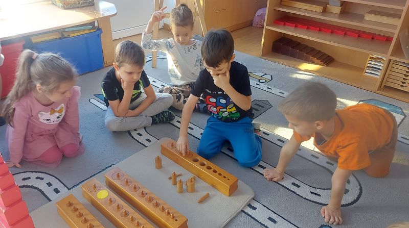 Dzięki wizycie w grupie Montessori, „Jeżyki” i „Biedronki” poznały postać Marii Montessori pochodzącej z Włoch – autorki metody pracy tej grupy. Pani Agnieszka przybliżyła przedszkolakom zasady pracy z materiałem, dzieci ze skupieniem układały różową wieżę oraz osadzały cylindry w blokach cylindrycznych, sprawdzały poprawność wykonanego zadania poprzez kontrolę błędu.