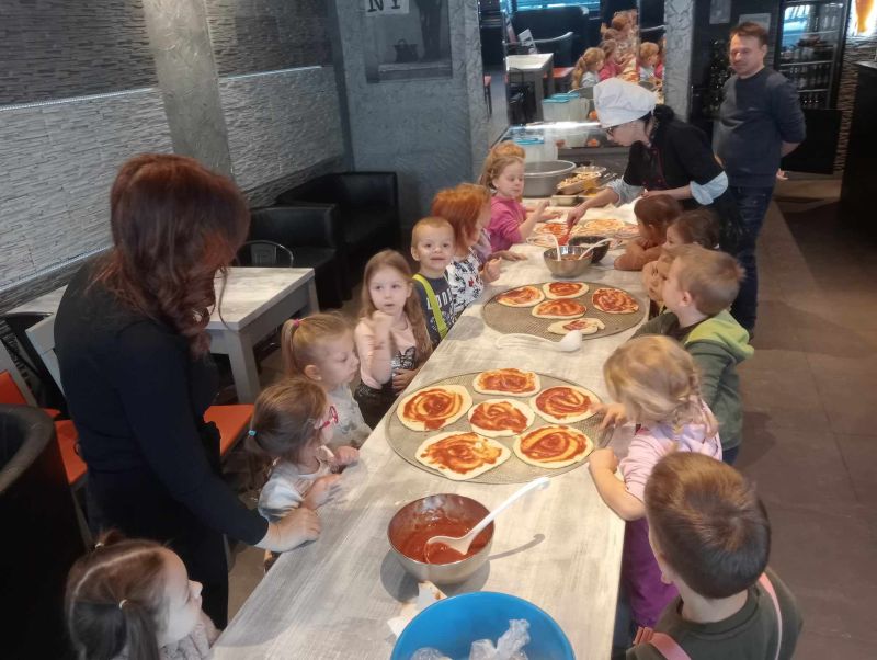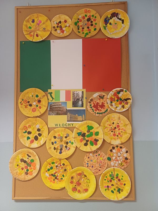 Kolejną niezwykłą podróż „Jeżyki” i „Biedronki” odbyły do Włoch. Poznały nazwę stolicy Rzym oraz najbardziej znane miejsca i zabytki tego pięknego kraju: Koloseum, Bazylikę św. Piotra, piękne rzeźby i fontanny oraz Krzywą Wieżę w Pizie. Dzieci podziwiały mosty w Wenecji i słynne gondole, dowiedziały się kim był gondolier. Podczas włoskiego tygodnia przedszkolaki poznały kulturę i smaki Italii w tym charakterystyczne dania włoskiej kuchni: pizzę, rissoto, makaron Spaghetti (również jako danie przygotowane przez panie kucharki na obiad), kawę cappuccino, lody. Wybrały się też do pizzerii, podczas warsztatów wykonały pizzę poprzez wałkowanie ciasta i samodzielne dobieranie składników, którą po upieczeniu z apetytem zjadły. Kolejnym przystankiem w podróży była Wenecja – miasto na wodzie słynące z Karnawału. Dzieci dowiedziały się, że Karnawał w Wenecji jest jednym z najpopularniejszych i najstarszych na świecie, przyciąga wielu turystów, którzy oglądają karnawałowe pochody i barwne stroje. Przedszkolaki oglądały zdjęcia z Wenecji przedstawiające osobliwości miasta (kanały, mosty, gondole, tramwaje wodne). Nauczyły się także kilku zwrotów w języku włoskim oraz piosenki „San Martino” śpiewanej na melodię „Panie Janie”, którą też wygrywały na bum bum rurkach.